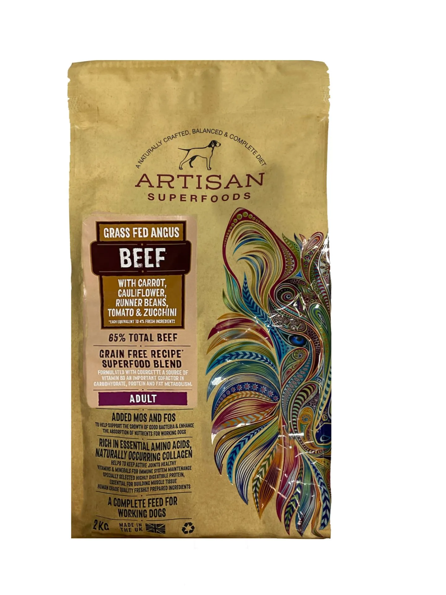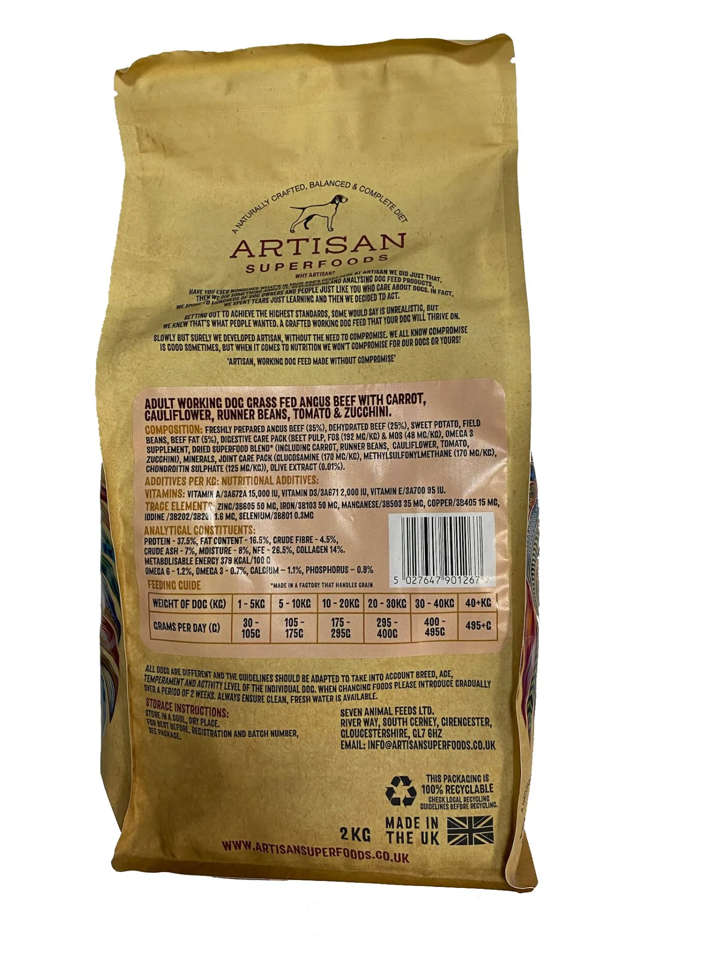Composition: Freshly prepared Angus Beef 35%, Dehydrated Beef 25%, Sweet Potato, Field Beans, Beef Fat 5%, Digestive Care Pack*, Omega 3 Supplement, Dried Superfood Blend (Including carrot, runner beans, cauliflower, tomato , courgette), Minerals, Joint Care Pack** , Olive Extract (0.01%)