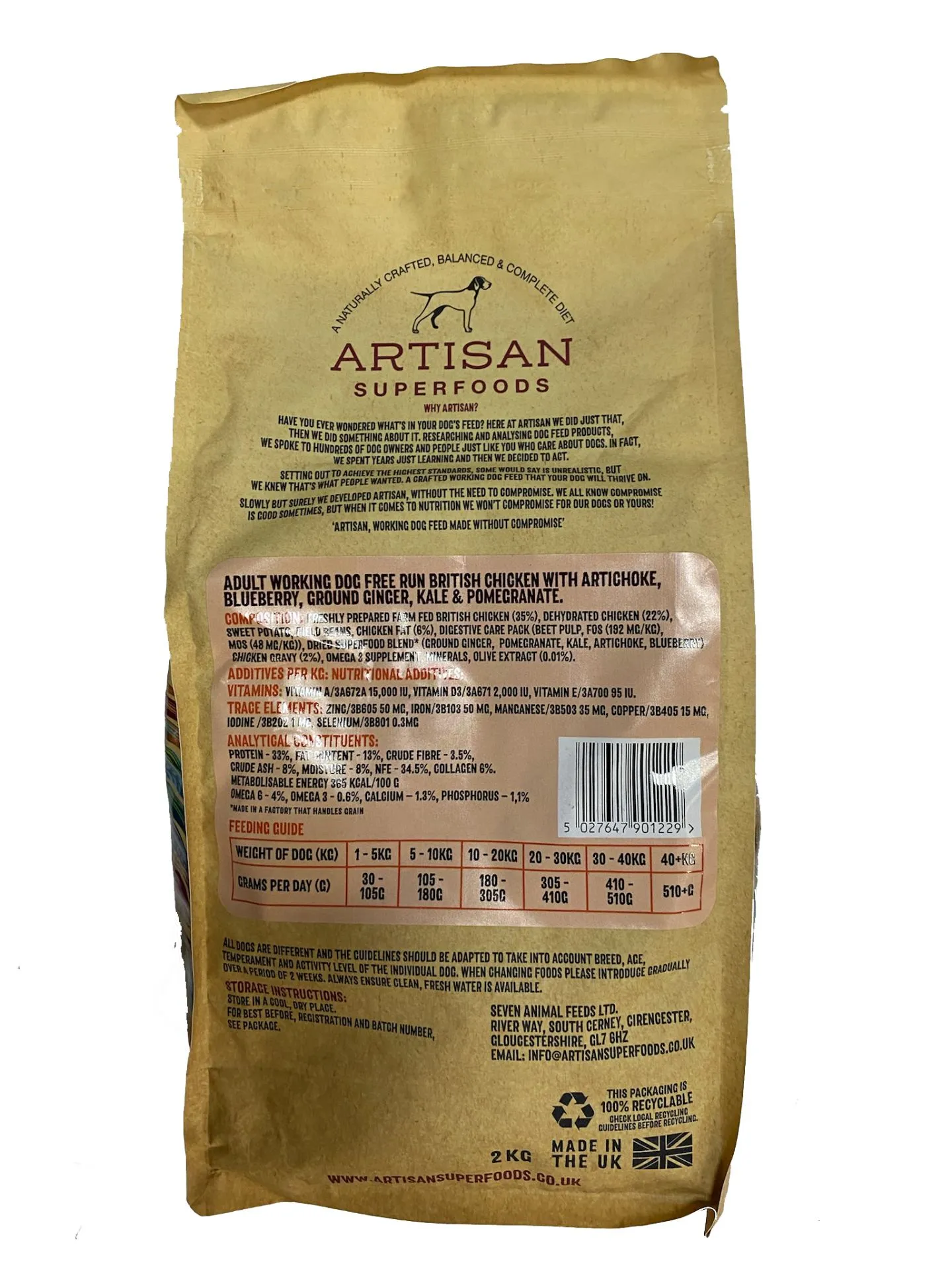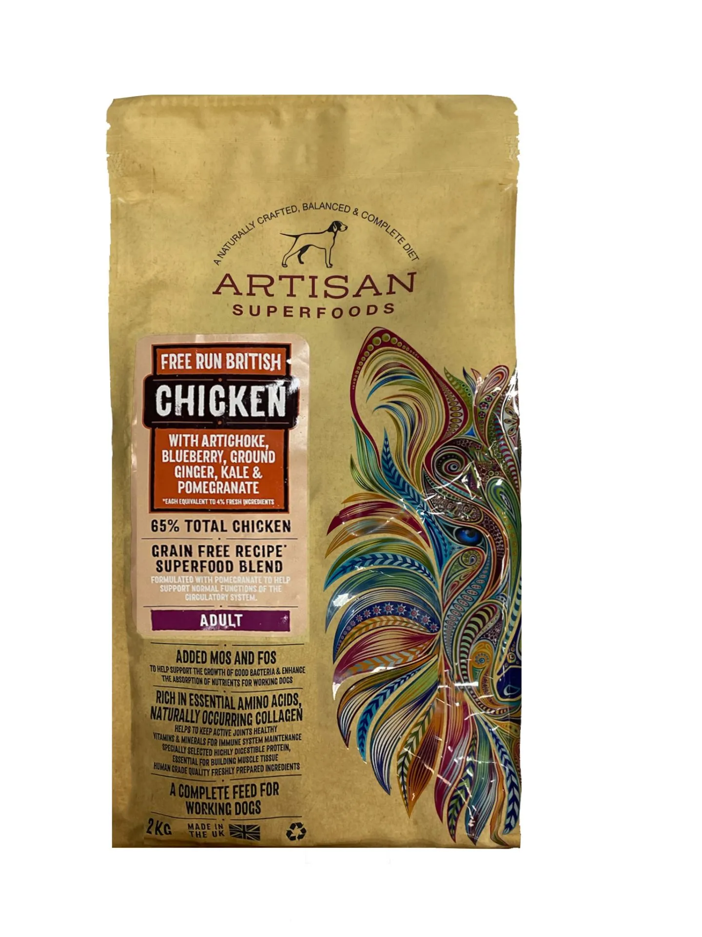 Composition: Freshly prepared Farm Fed British Chicken 35%, Dehydrated Chicken 22%, Sweet Potato, Field Beans, Chicken Fat 6%, Digestive Care Pack* , Dried Superfood Blend (Groud ginger, Pomegranate, Kale, Artichoke, Blueberry), Chicken Gravy 2%, Omega 3 Supplement, Minerals, Olive Extract (0.01%)