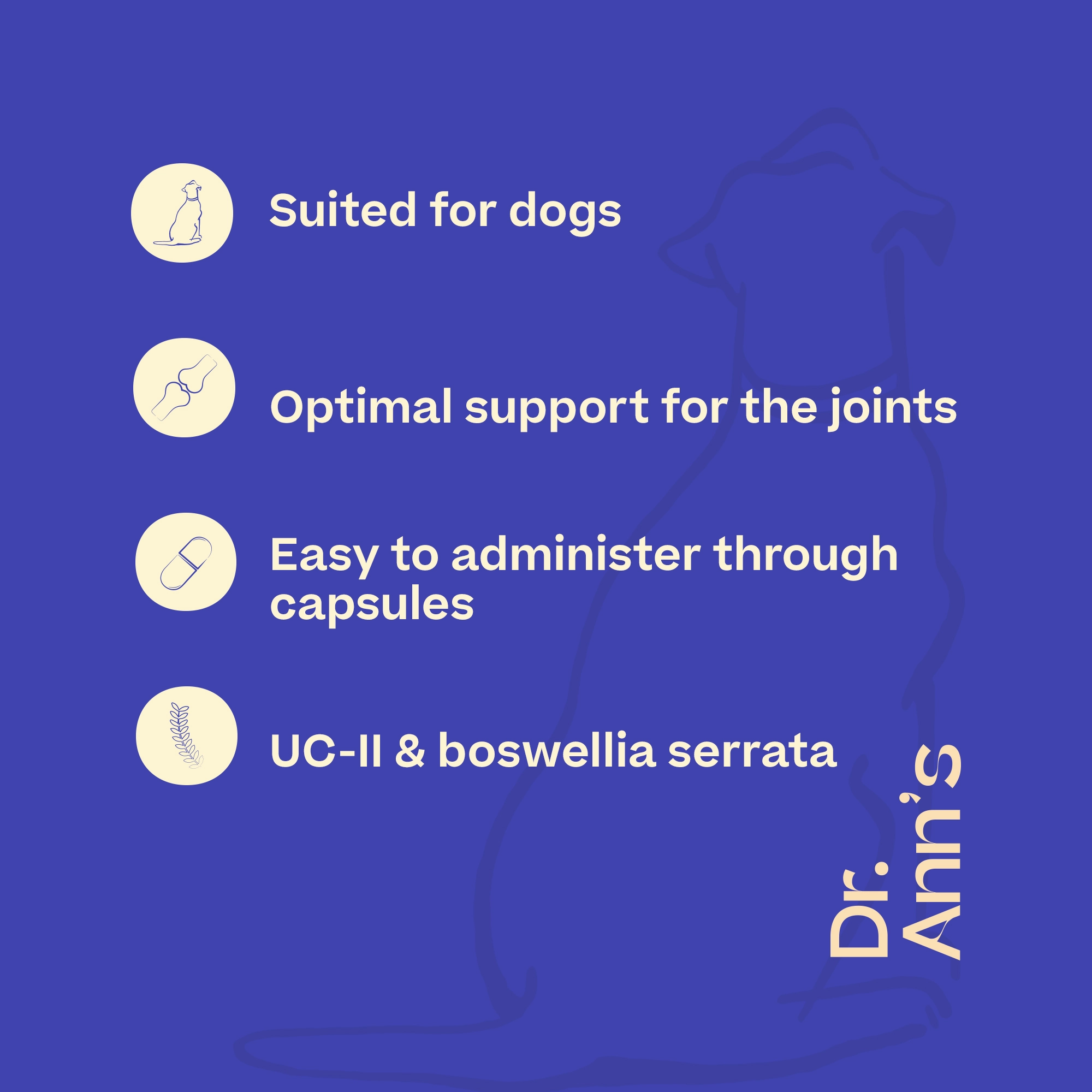 Dr. Ann’s Mobility Support Advanced is a dog supplement that supports the joints. These capsules contain UC-II® (undenatured collagen type 2), omega 3 fatty acids, Boswellia serrata and vitamin E. Collagen type 2 is an important component of joint cartilage. The additional contribution of Boswellia serrata helps maintain flexible joints and strong muscles. Vitamin E has an anti-oxidative effect and helps protect healthy body cells.