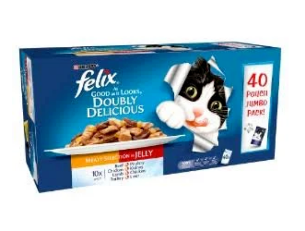 Felix is as good as it looks Doubly Delicious is a range of tasty, high-quality cat food made with two different, tender, meaty or fishy variants in a yummy jelly. Each recipe looks and smells tasty it looks like you could have cooked it yourself. That’s not all! In every serving, there is a source of essential Omega 6 fatty acids and has the right combination of balanced nutrients to satisfy 100% of your cat’s daily needs. Doubly Delicious provides the fusion of two delicious flavours to help provide your cat with all of the necessary minerals, proteins and vitamins to give your cat all of their daily needs.