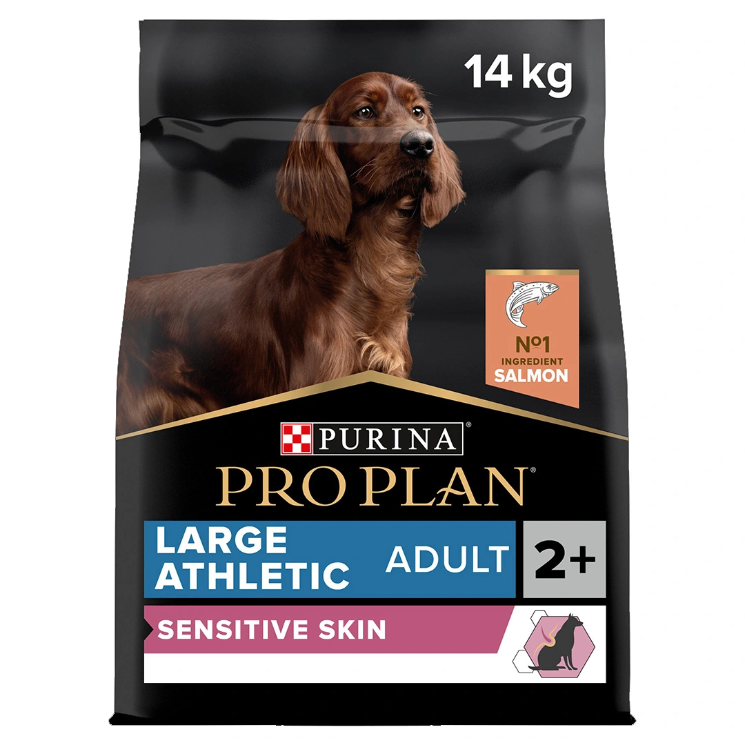 Purina PRO PLAN Sensitive Skin LARGE ATHLETIC ADULT has been developed for adult dogs of large athletic breeds (more than 25 kg weight). This dry dog food contains vitamin D, minerals and specific levels of omega-3 fatty acids to help support healthy teeth and gums. It is rich in high quality salmon and provides optimal nutrition for your large dog’s adventures from 18-24 months until 7 years of age.