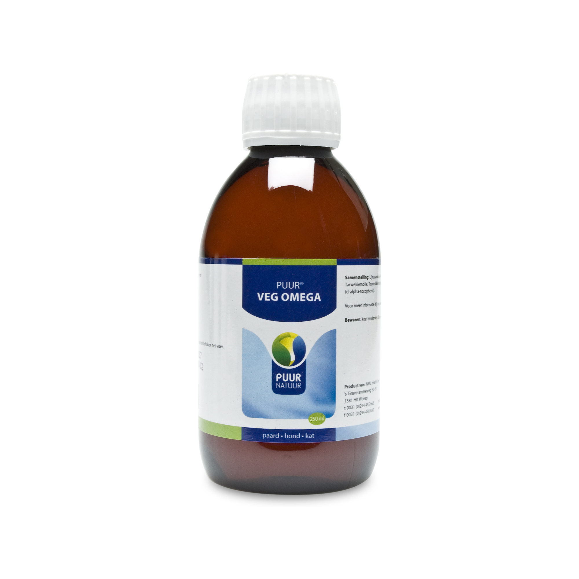 Puur Veg Omega contains Omega 3, 6 and Omega 9 essential vegetable fatty acids in the ideal proportion, allowing the fatty acids to be absorbed well. Omega 3 and Omega 6 fatty acids have a positive effect on the body if they are offered in the right proportion. Puur Veg Omega helps cleanse the vascular system, supple muscles and joints, and contributes to good skin and coat condition. It has a positive effect on the urinary tract and has a cleansing effect in the intestines. It also provides extra energy and reduces acidification.